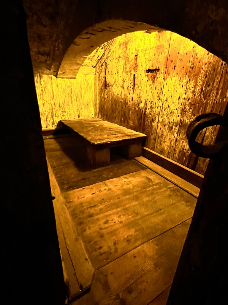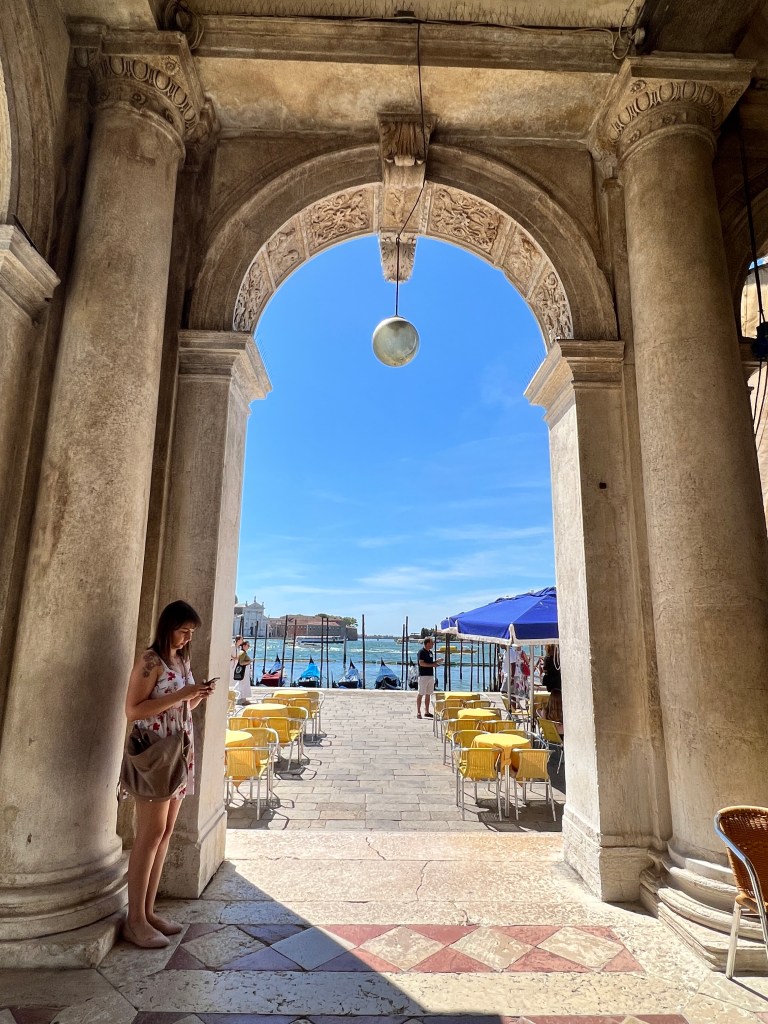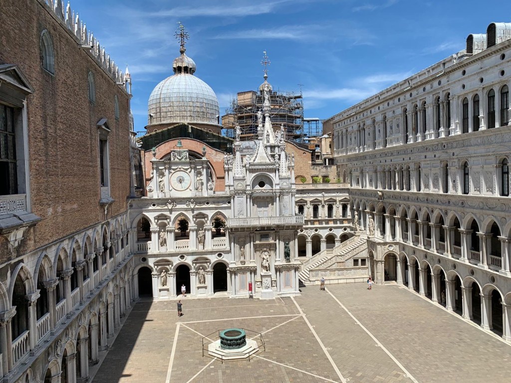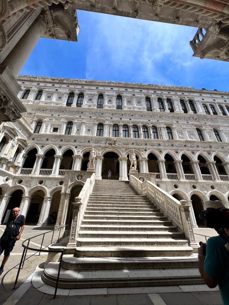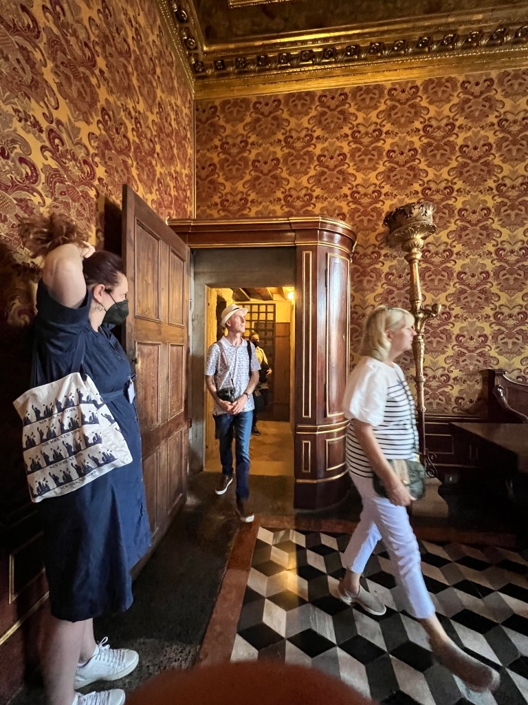 We are finally getting the hang of finding the correct line to stand in. Right on time Eileen and Jim join us for the tour. The Doge’s Palace was the seat of the Venetian government and home of its ruling duke or doge. The palace was built to show off the power of the republic and is resplendent in gold leaf, paintings, and glitz. Hiding behind the halls of power, was a prison that at one time held Casanova along with many others. He was not only a great seducer of women, but he was the only person who managed to escape from the prison. That was where our tour primarily took place. Frankly it wasn’t as interesting as I had hoped, but it is crazy to think about the juxtaposition of incredible wealth in contrast to cold, stone jail cells. In addition, the administrative offices for those running Venice were directly next to the prison and were devoid of any decoration, including the Doge’s office. The intention was for the doge himself to remain humble.