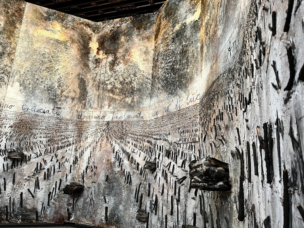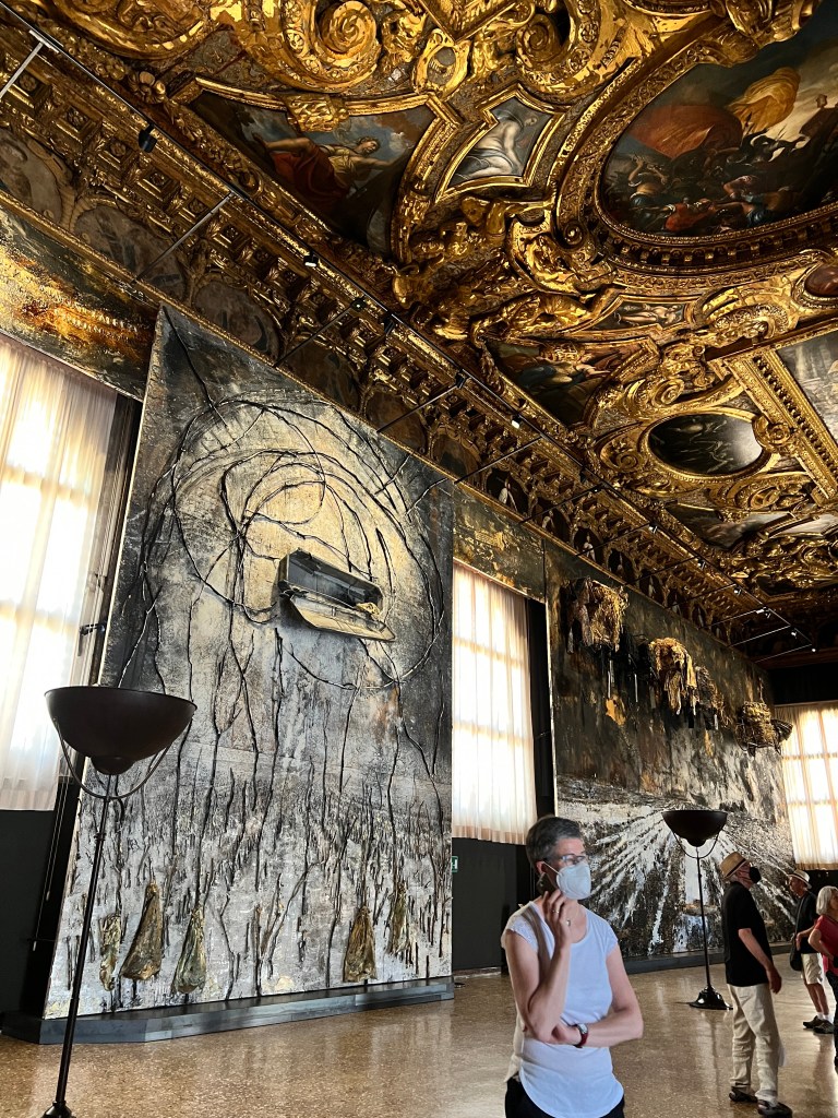 On our escape route out of the palace we came upon a special exhibit of modern art by German painter/sculptor Anselm Kiefer. He was invited to present a site-specific installation of paintings as part of the 59th Venice Biennale. He combines philosophical thought and literary references in his art and confronts Germany’s dark past, i.e. the Holocaust. The Biennale is a large scale exhibition of contemporary art held every two years in Venice. It has been held since 1895. The commingling of new and old art created a unique space.