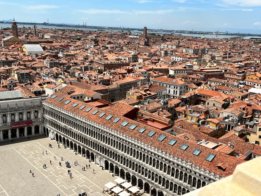 Upon our escape from the Doge’s Palace we stood in a surprisingly short line to go to the top of the Campanile Bell Tower by elevator. Thank goodness no steps this time. We had wonderful panoramic views of Venice from up there. We also had a deafening surprise when at 2:00 PM the bells began to ring. We were in a bell tower next to the bells after all. The campanile was completed in 1514 when the belfry and spire were completely rebuilt. It was originally intended as a watchtower, but eventually the bells served to regulate the civic and religious life of Venice marking the time of day, convocation of government assemblies, and public executions.