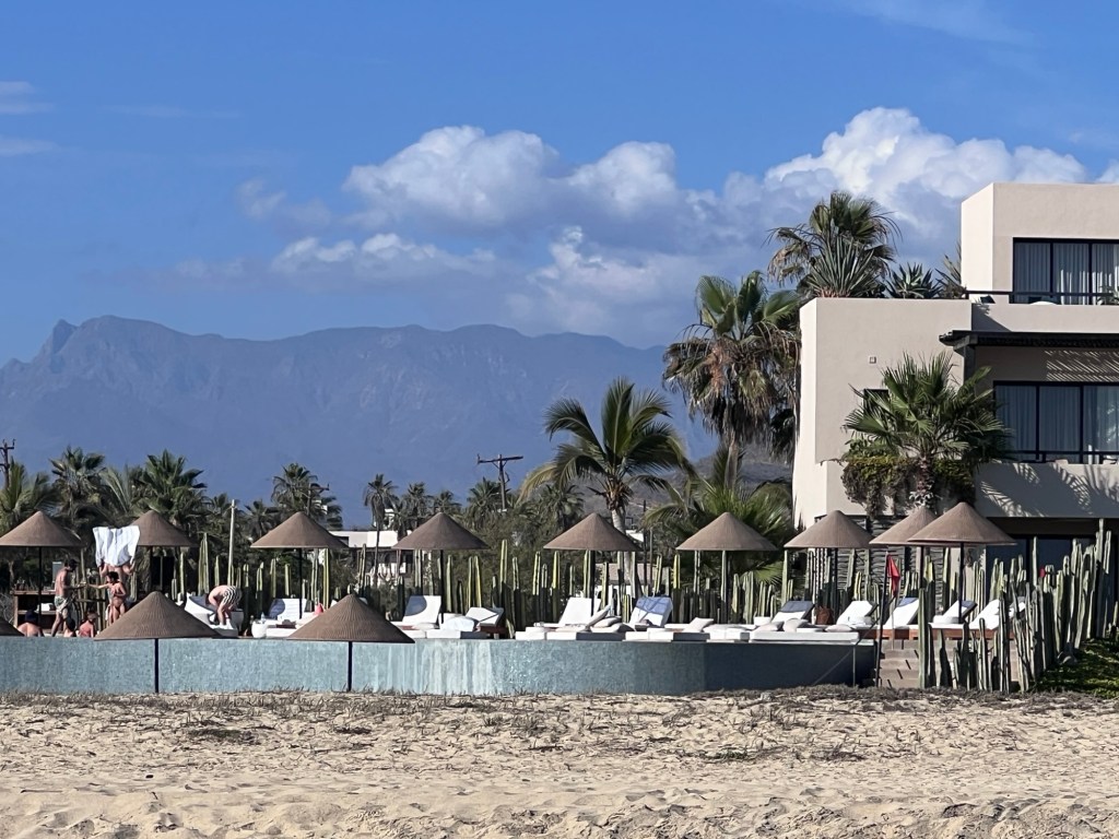 View of infinity pool from the beach with the sierra de la Laguna mountains in the background
