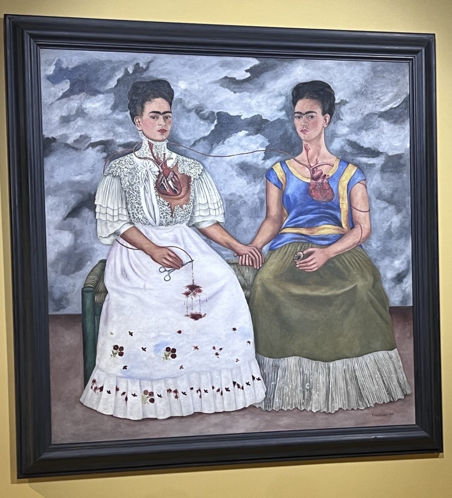 The remarkable painting, The Two Fridas, was painted by Frida Khalo in 1939, the year she and Diego Rivera divorced. The painting featured two seated figures holding hands and sharing a bench in front of a stormy sky. The two Fridas are identical except in their dress. The healthy heart of the Mexican-dressed Frida, on the right, represents the Frida that was loved by Diego Rivera. The broken, bleeding heart of the European-dressed Frida, on the left, symbolizes Rivera’s rejection of her. The vein connecting the two hearts shows their link, while the surgical forceps in the European Frida’s hand, as well as the blood stains on her dress, illustrate her efforts to stop the bleeding from their broken relationship.