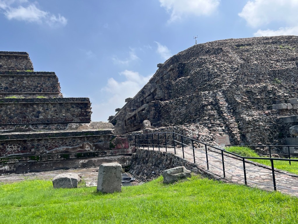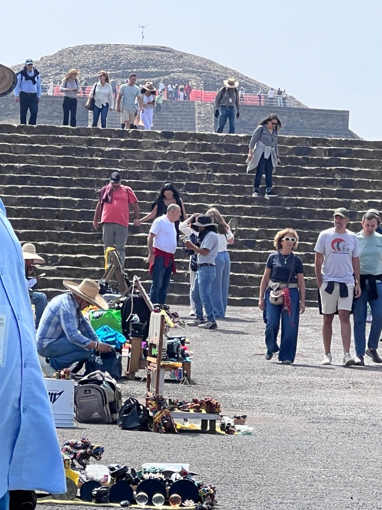 As of May 2025, tourists have been allowed to climb the 47 steps to the top of the first section of the Pyramid of the Moon, as well as to the top of five additional platforms. While there were vendors located throughout Teotihuacan, knowing that tourists would spend the most time in this particular area made it a popular spot for vendors selling a wide variety of local handicrafts. Far too many of them were selling a whistle-like toy that made very irritating high pitched screeching sounds meant to imitate an eagle or a puma. We definitely would have gotten into serious trouble if we had brought any of those whistles home for the grandchildren. Others sold lovely woven rugs, typical Mexican styled clothing, silver jewelry, pieces of shiny onyx through which you could view the sun, and countless other goods.