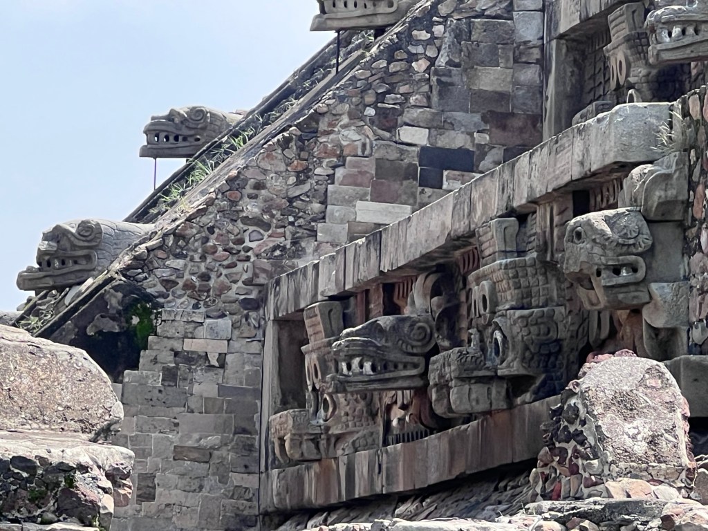 The third largest pyramid in Teotihuacan was the Temple of the Feathered Serpent. It is also the most ornate. Built between 150 and 200 CE, the facade is adorned with amazing carvings. Imagine them being painted in bright blue, red, green, and yellow, with the eyes of these mythical creatures filled with obsidian glass. Archeologists think it may have been built to venerate the “sacred” calendar cycle.